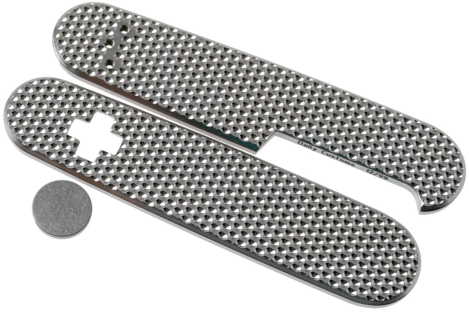 Estas Daily Customs 91.3 Golfball BS Pattern, Titanium P10012430 cachas Victorinox están hechas para navajas Victorinox con una longitud cerrada de 91 mm. Con estas cachas puedes actualizar tu querido clásico suizo.