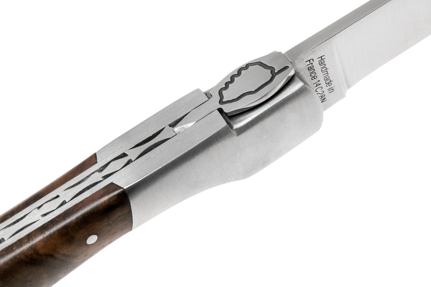 Clásica navaja francesa hecha a mano de Laguiole. Longitud cerrada: 12,3 cm. Cuenta con una hoja de acero 12c27 y un sistema de bloqueo backlock. El mango es de madera de nogal.