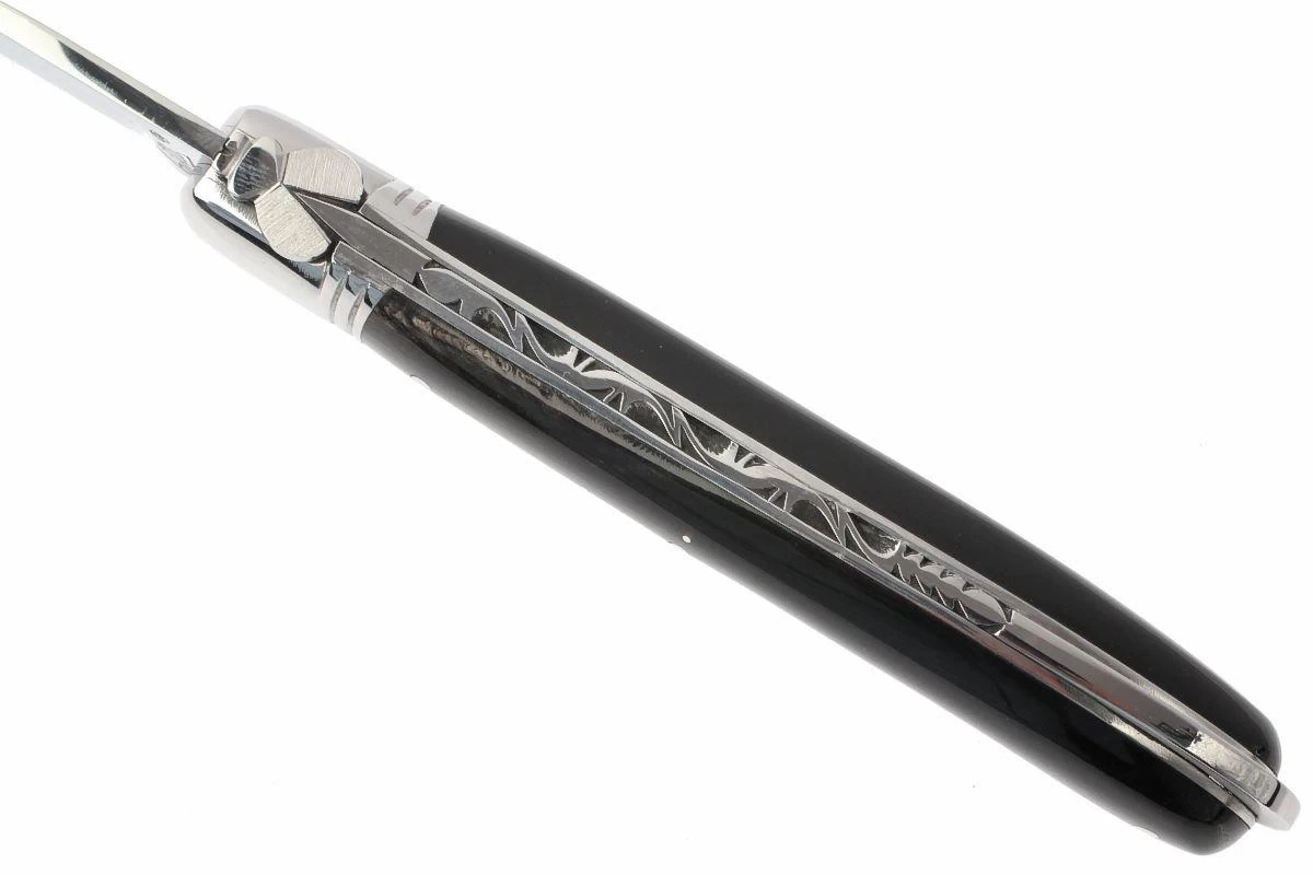 Clásica navaja artesanal francesa Laguiole. Longitud plegada: 12 cm. Diseño exclusivo con una hoja fabricada en acero 12c27. Equipada con un práctico mecanismo de bloqueo. Mango con carcasa de cuerno de búfalo negro, decorado con el tradicional diseño de cruz metálica. El mango de cada cuchillo es único.