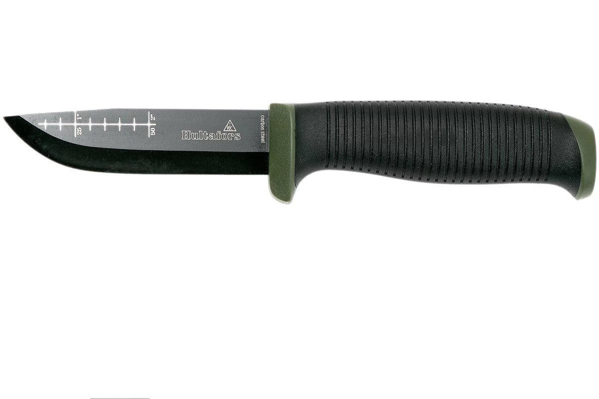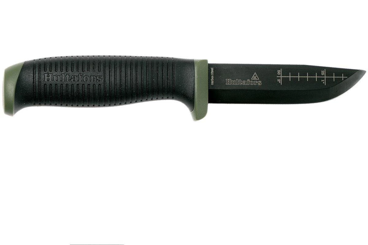 El cuchillo de exterior Ok4 de Hultafors es un popular cuchillo fijo de bushcraft. Su aspecto es similar al cuchillo Craftsman’s knife GH, pero está optimizado para su uso en exteriores. El revestimiento negro protege la hoja de acero al carbono de la corrosión. La parte posterior de la hoja es plana, para que funcione mejor con un yesquero. Una regla de cinco centímetros de longitud está grabada en el lateral de la hoja. El Hultafors OK4 es una opción ideal y asequible para la caza, la supervivencia y otras actividades al aire libre.