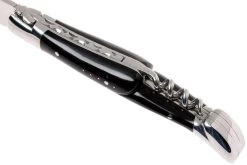 Esta navaja Laguiole en Aubrac de 12 cm tiene un sacacorchos. No sólo se beneficia de las funcionalidades de esta impresionante navaja Laguiole, sino que también es capaz de abrir una botella de vino.