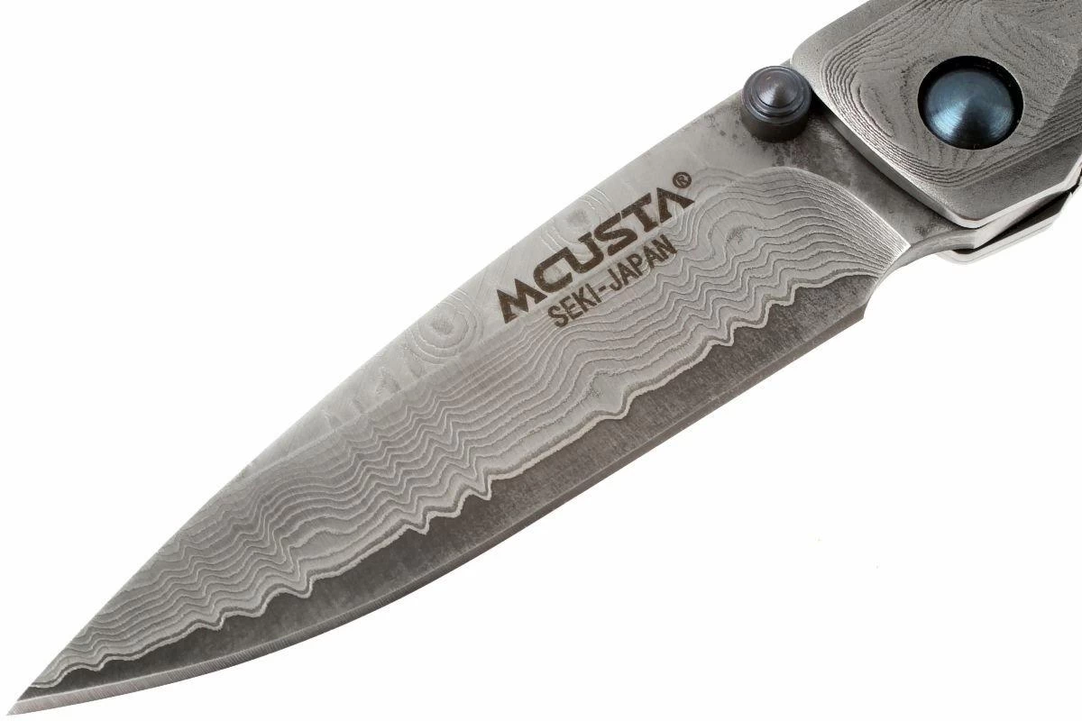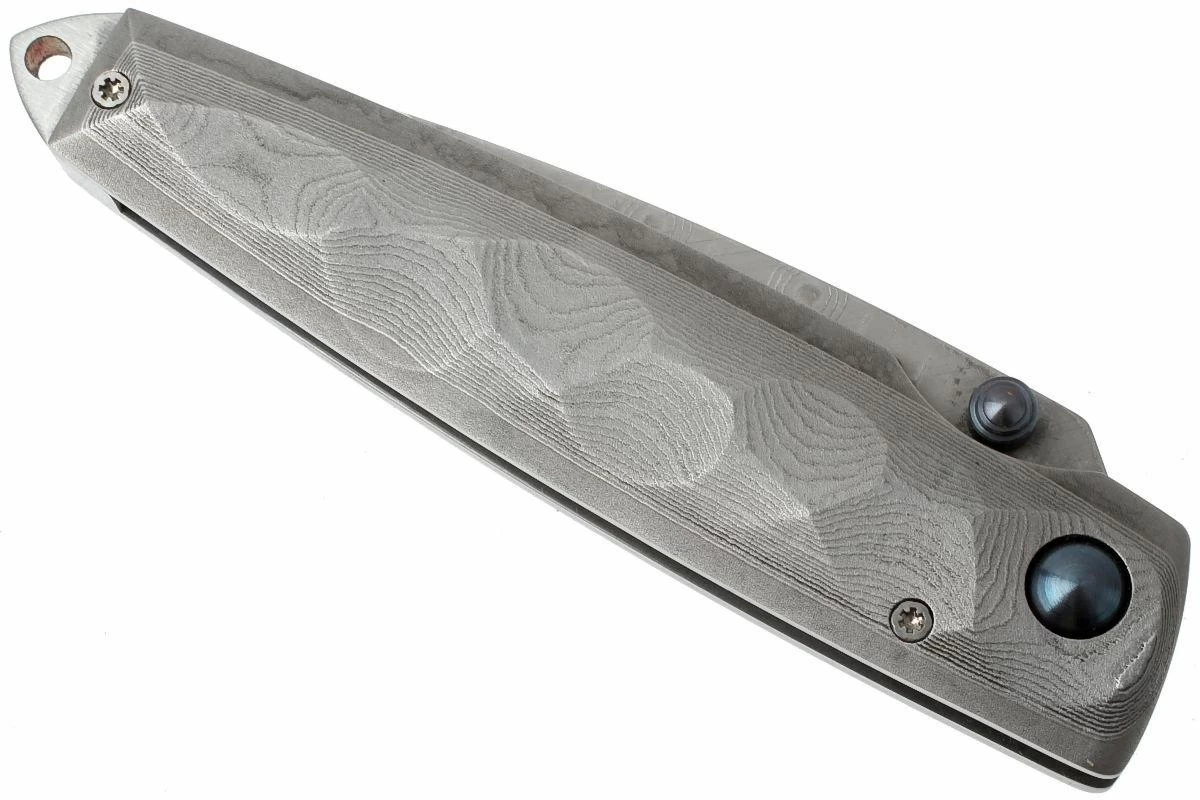 El Mcusta MC-34D Shinra Tsuchi es un elegante cuchillo de caballero. El mango del Tsuchi 34D está fabricado en acero de damasco con un acabado impresionante. La superficie está realzada con un patrón que podría llamarse acabado de martillo grueso. Es agradable al tacto y provoca una refracción de la luz que hace resaltar aún más el dibujo del acero damasquinado. El acero del mango y el acero de damasco de la hoja encajan perfectamente.