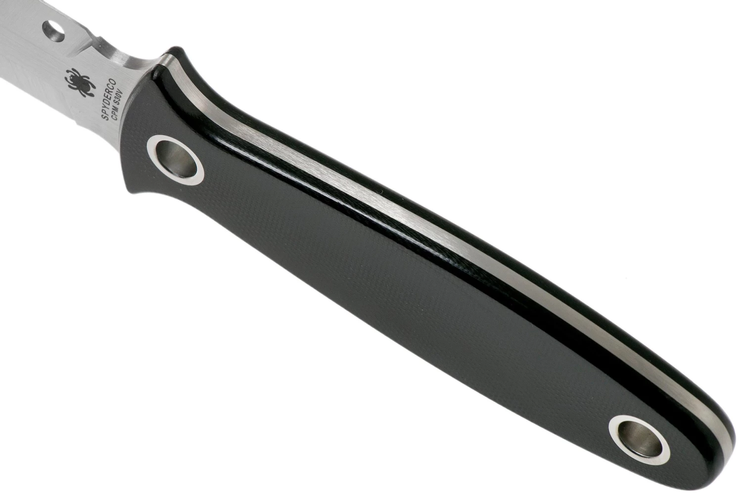 El Spyderco Nightstick FB47GP es un cuchillo fijo genial, diseñado por Gayle Bradley. Este famoso fabricante de cuchillos estadounidense se inspiró en las clásicas dagas de bota para este cuchillo. Fiel a esos cuchillos, el Nightstick también parece tener un doble filo. Sin embargo, el dorso no está afilado. Por ello, puedes llevar el Nightstick legalmente en muchos lugares del mundo.
