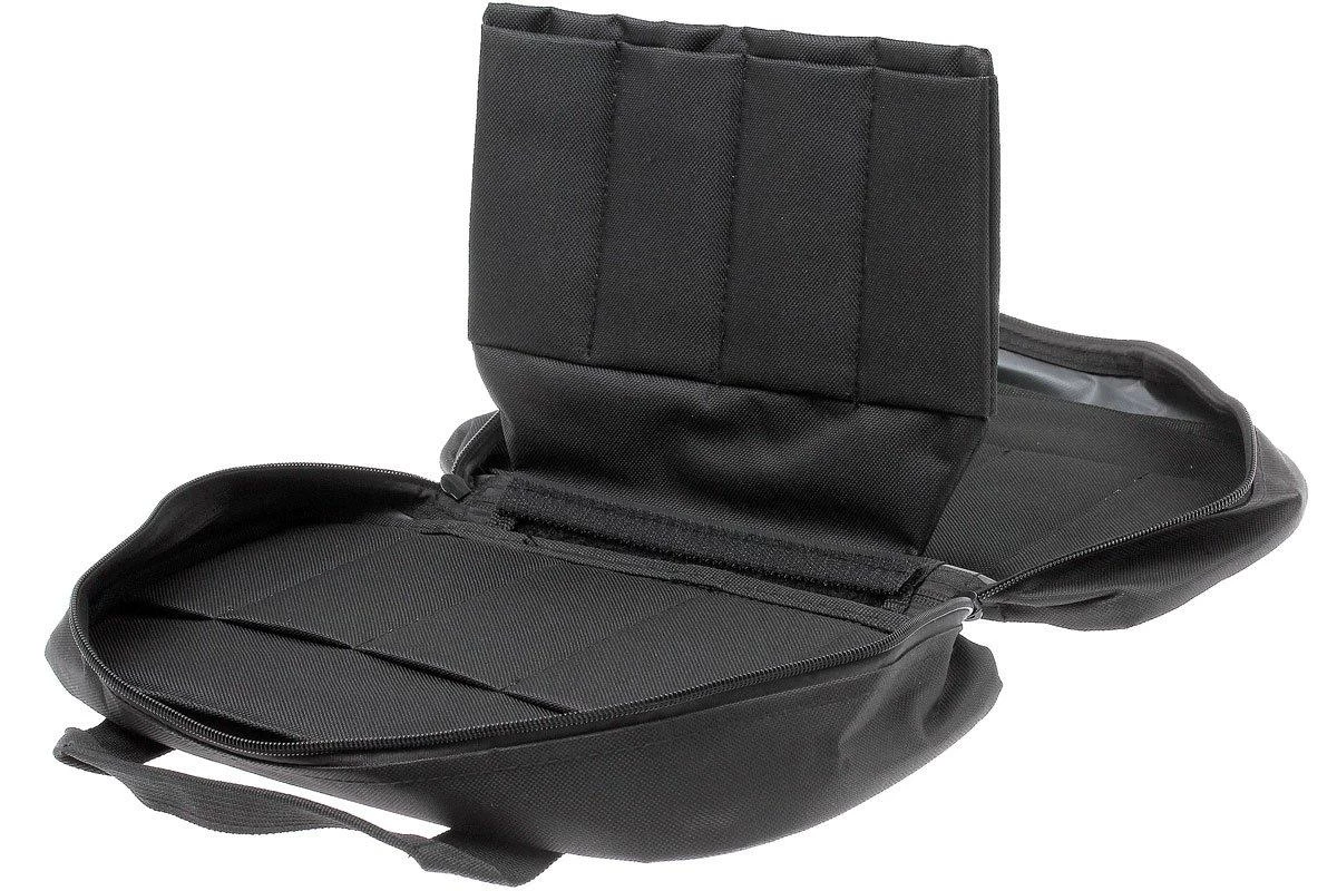 La bolsa para cuchillos Zero Tolerance ZT997 es perfecta si quieres transportar varios cuchillos, o quieres guardarlos de forma segura. La bolsa está hecha de nylon y está reforzada con un grueso «acolchado» para que tus cuchillos estén guardados en un lecho suave y seguro. La parte central (con espacio suficiente para 8 cuchillos) se puede quitar, para dejar más espacio en los otros compartimentos en términos de grosor. Los diferentes compartimentos son a veces un poco diferentes en tamaño. De este modo, tienes espacio para las navajas más grandes, pero también para las más pequeñas.